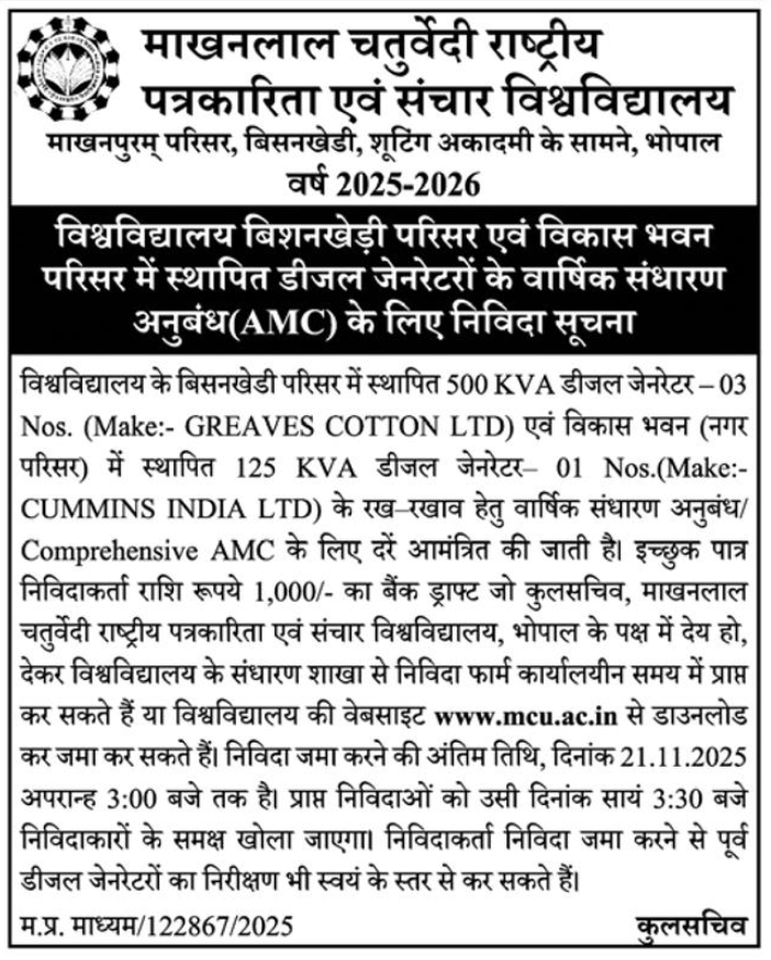 विश्वविद्यालय बिशनखेड़ी परिसर एवं विकास भवन परिसर में स्थापित डिजल जेनरेटरों के वार्षिक संधारण अनुबंध (AMC) के लिए निविदा सूचना