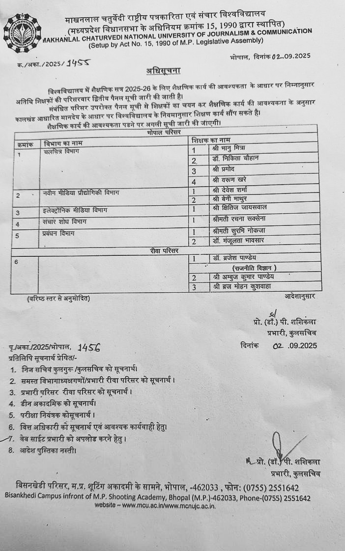 शैक्षणिक सत्र 2025-26 हेतु अतिथि व्याख्याताओ के लिए दिनाक 08.09.2025 वॉक-इन-इंटरव्यू (04/09/2025) Recent NewsBy mcuadmin4th September 2025