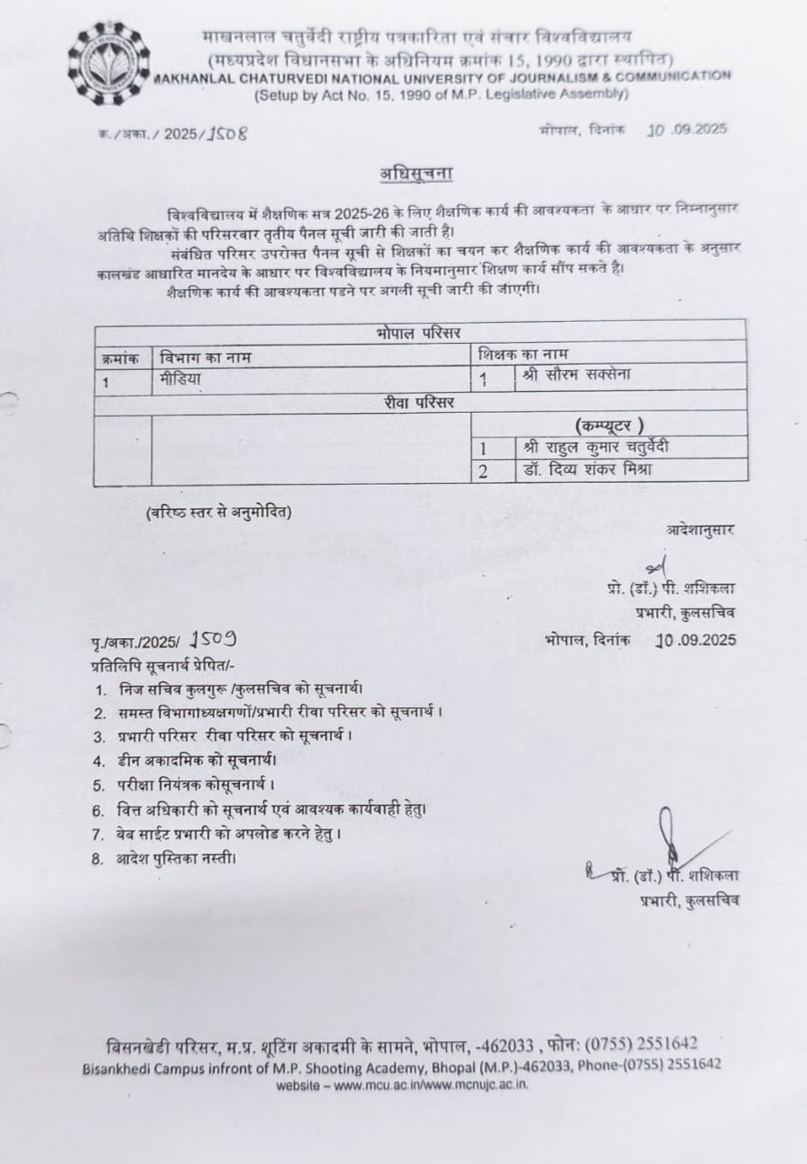 की उपलक्ष में आयोजित कार्यक्रम में विभिन्न वक्ताओं ने एक स्वर से कही। हिंदी दिवस उत्साह और गरिमा के साथ मनाया गया। कार्यक्रम की शुरुआत छात्रों द्वारा हिंदी भाषा के महत्व पर विचार प्रस्तुत करने से हुई। विद्यार्थियों ने अपनी-अपनी कविताओं, लघु कथाओं और शोधपत्रों के माध्यम से हिंदी की संवेदनशीलता, विविधता और प्रासंगिकता पर प्रकाश डाला। उत्सव के दौरान प्रस्तुत किए गए रचनात्मक योगदानों ने न केवल भाषा के सौंदर्य को उजागर किया बल्कि सामाजिक और सांस्कृतिक सरोकारों को भी सामने रखा। कार्यक्रम का मुख्य आकर्षण रहा सृष्टि कुमारी का हिंदी पर विशेष शोध, जिसमें उन्होंने हिंदी भाषा की वर्तमान स्थिति और भविष्य की संभावनाओं पर सारगर्भित दृष्टिकोण प्रस्तुत किया। वहीं सत्यम मिश्रा ने पाश्चात्यीकरण के संदर्भ में “सिंहासन खाली करो कि जनता आती है” पर आधारित अपनी कविता से श्रोताओं को गहराई से प्रभावित किया। इसके अतिरिक्त कार्यक्रम की अध्यक्षता कर रहे उद्यांश पाण्डेय ने हिंदी की सामाजिक, सांस्कृतिक और साहित्यिक भूमिका पर विशेष उद्बोधन देते हुए विद्यार्थियों को मातृभाषा के महत्व से अवगत कराया। इस आयोजन में छात्रों की सक्रिय भागीदारी और प्रस्तुतियों ने यह सिद्ध कर दिया कि नई पीढ़ी हिंदी भाषा को न केवल आत्मसात कर रही है, बल्कि उसे और समृद्ध बनाने का भी संकल्प ले रही है। उत्सव का वातावरण पूरे समय उत्साह और सृजनात्मक ऊर्जा से भरा रहा। हिंदी दिवस का यह आयोजन विभाग के लिए एक यादगार क्षण साबित हुआ, जिसने विद्यार्थियों और शिक्षकों दोनों को भाषा की गरिमा और महत्व के प्रति पुनः प्रेरित किया।इस अवसर पर विभाग की अध्यक्ष डॉ. राखी तिवारी, प्रोफेसर शिवकुमार विवेक सहित सभी शिक्षकगण उपस्थित रहे। कार्यक्रम का संचालन और आयोजन विभाग के छात्र-छात्राओं सृष्टि कुमारी, उद्यांश पाण्डेय, अभिराज मिश्रा और कार्तिकेय पाण्डेय के नेतृत्व में किया गया। इस अवसर पर क्विज प्रतियोगिता की विजेता छवि बाथम को पुरस्कृत किया गयामाखनलाल पत्रकारिता विश्वविद्यालय में हिंदी दिवस का उत्सव : हिंदी राष्ट्रीय सौहार्द की भाषा, बन सकती है राष्ट्रीय एकता की सबसे अच्छी कड़ी भोपाल, 14 सितम्बर। हिंदी सौहार्द की भाषा है। यह राष्ट्रीय एकता की सबसे अच्छी कड़ी बन सकती है। यह बात माखनलाल चतुर्वेदी राष्ट्रीय पत्रकारिता एवं संचार विश्वविद्यालय के पत्रकारिता विभाग में हिंदी दिवस…