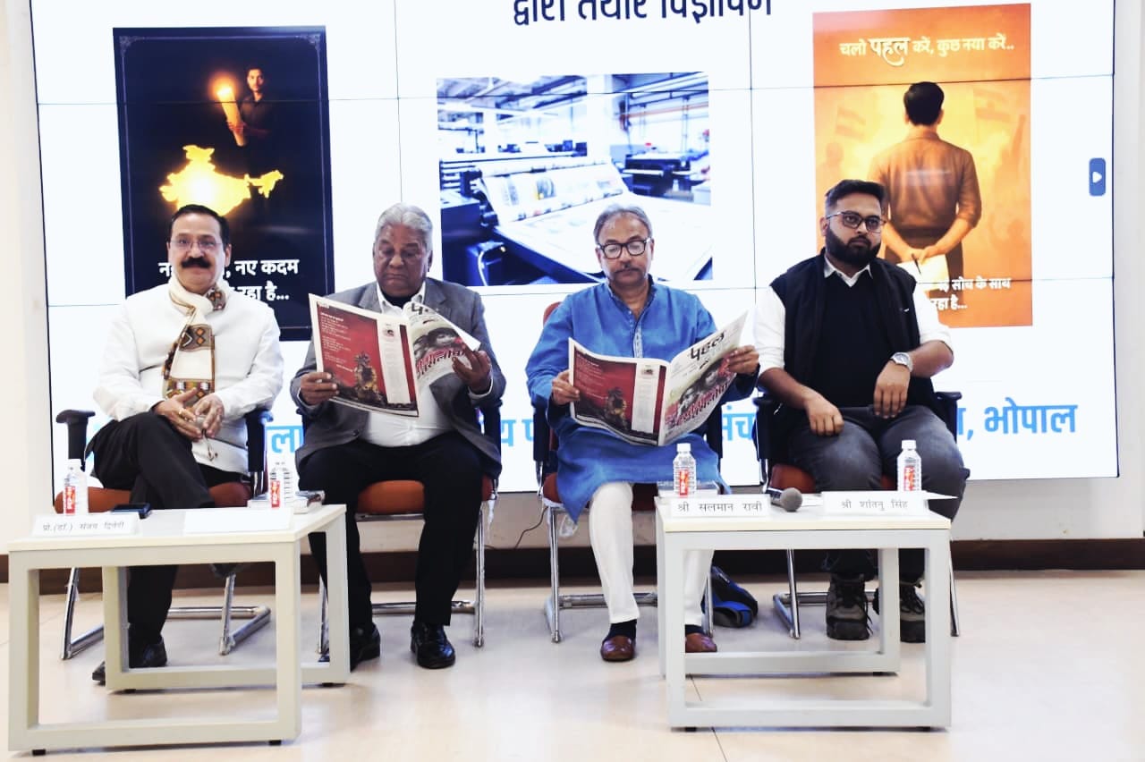भोपाल, 15 दिसंबर 2025 : ‘बंगलादेश विजय दिवस’ की पूर्व संध्या पर माखनलाल चतुर्वेदी राष्ट्रीय पत्रकारिता एवं संचार विश्वविद्यालय के जनसंचार विभाग के प्रायोगिक पत्र ‘पहल’ के बांग्लादेश विशेषांक का लोकार्पण विश्वविद्यालय परिसर स्थित भारत रत्न लता मंगेश्कर सभागार में संपन्न हुआ। कार्यक्रम में बीबीसी के पूर्व वरिष्ठ पत्रकार सलमान रावी, बंगाली एसोसिएशन कालीबाड़ी के महासचिव सलिल चटर्जी तथा विश्वविद्यालय के कुलगुरु प्रो. विजय मनोहर तिवारी ने विद्यार्थियों को संबोधित किया।