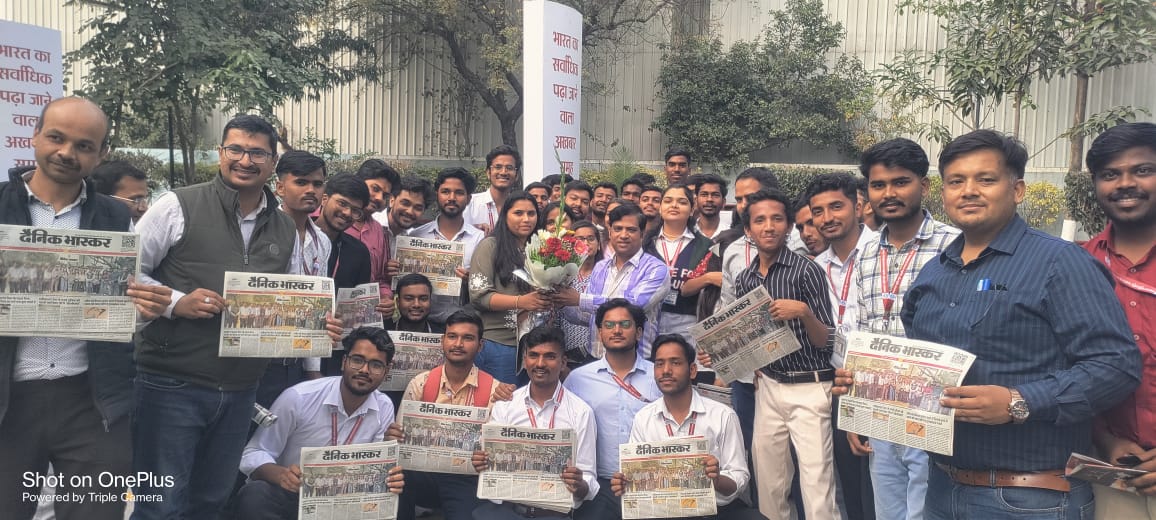 इस कड़ी मे दूसरा शैक्षणिक भ्रमण भास्कर समूह के न्यूज़ पेपर प्रोडक्शन प्लांट मे किया गया।वहां विद्यार्थियों का मार्गदर्शन श्री हेमंत सक्सेना ( जनरल मैनेजर प्रोडक्शन ) द्वारा किया गया।सर्वप्रथम उनके द्वारा भास्कर समूह के बारे मे बताया गया एवं एक शार्ट विडिओ के माध्यम से दिखाया गया की न्यूज पेपर इंडस्ट्री कैसे कार्य करती है।भास्कर के अन्य विभाग जैसे न्यूज़ डिपार्टमेंट, एडवरटाइजिंग डिपार्टमेंट, एडिटिंग डिपार्टमेंट, प्री प्रेस डिपार्टमेंट, प्रोडक्शन, सर्कुलेशन कार्य के बारे मे विस्तार से बताया गया।भास्कर द्वारा फ्रंट पेज प्रिंटिंग एडवरटाइजिंग एवं युवी प्रिंटिंग जैसे नये प्रयोगों को भी दिखाया गया। जो की विद्यार्थियों के लिए नया अनुभव रहा। इसके पश्चात सी टी पी रूम मे सी टी पी मशीन के बारे मे विस्तार से बताया एवं पूर्ण ऑटोमैटिक वेब ऑफसेट मशीन का संचालन और मशीन के बारे मे जानकारी दी गयी और मशीन संचालन करके 4 पेज का स्पेशल एडिशन निकाल गया जिसमे मुख्य पृष्ठ पे विद्यार्थी समूह की फोटो को मुद्रित किया गया जो की सभी विद्यार्थियों के लिया नया अनुभव रहा।