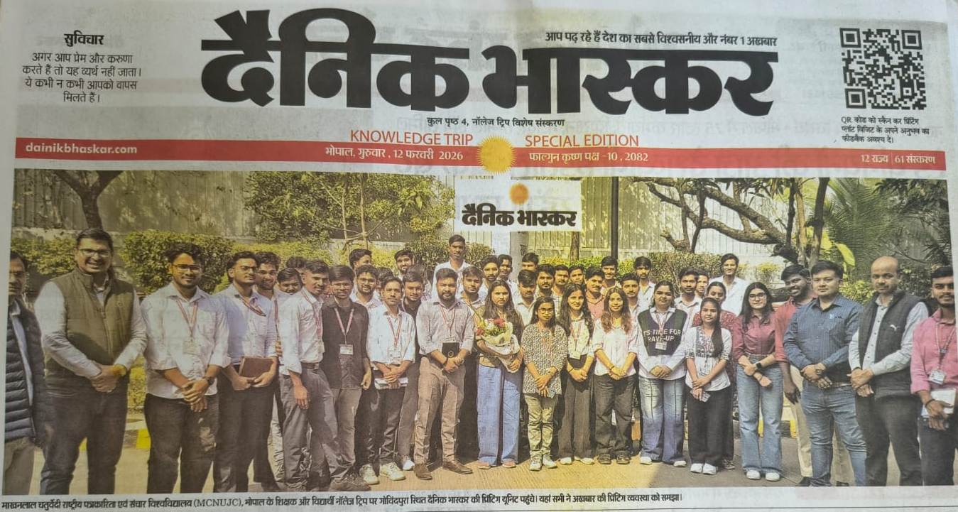 दिनांक: 12 फरवरी 2026 को माखनलाल चतुर्वेदी राष्ट्रीय पत्रकारिता एवं संचार विश्वविद्यालय के नवीन मीडिया प्रौद्योगिकी विभाग के बीटेक (प्रिंटिंग एंड पैकेजिंग ),दैनिक भास्कर समूह एवं कैलाश प्रिंटर्स भोपाल का शैक्षणिक भ्रमण किया। इस भ्रमण का मुख्य उद्देश्य विद्यार्थियों को प्रिंटिंग एवं पैकेजिंग की नयी मशीन एवं तकनिको से अवगत करना एवं व्यावहारिक ज्ञान प्रदान करना था।