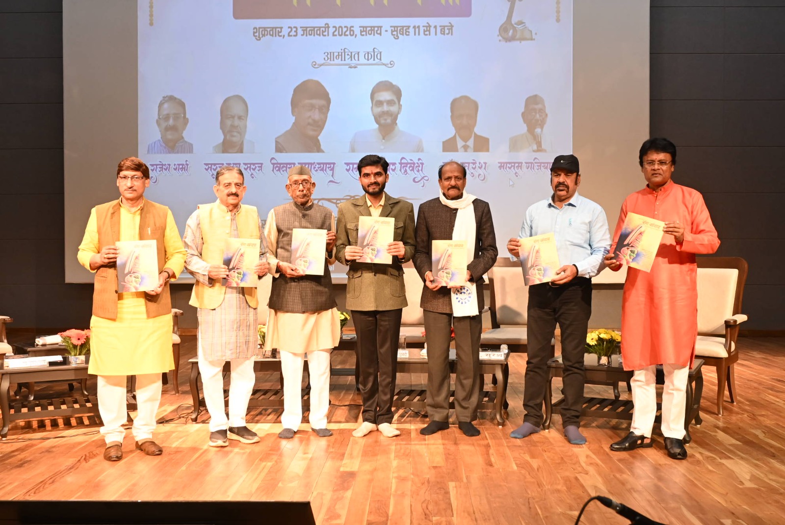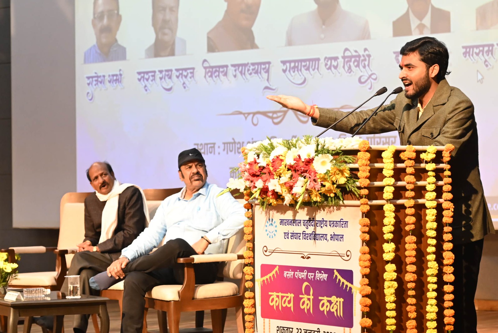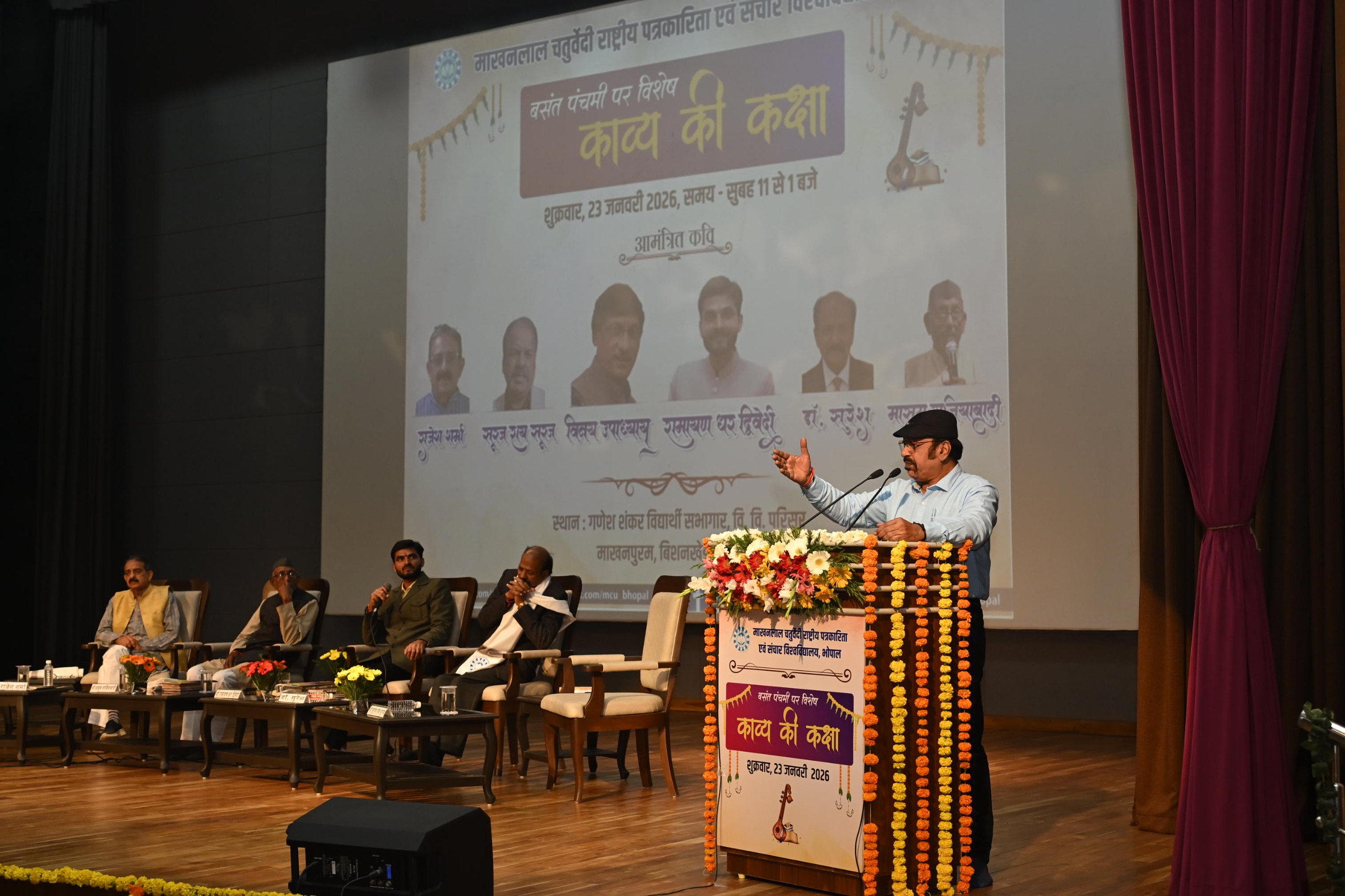भोपाल 23 जनवरी 2026: वसंत पंचमी पर माखनलाल चतुर्वेदी राष्ट्रीय पत्रकारिता एवं संचार विश्वविद्यालय का परिसर आज कविता, गीत और दोहों से सराबोर हुआ। अवसर था विश्वविद्यालय द्वारा विद्यार्थियों के लिए आयोजित ‘काव्य की कक्षा’ कार्यक्रम का। इस आयोजन में देश के 5 प्रख्यात कवियों रामायण धर द्विवेदी, सूरज राय ‘सूरज’, डॉ. सुरेश, राजेश शर्मा एवं मासूम गाजियाबादी ने विद्यार्थियों के सामने गीतों, कविताओं एवं दोहों की अद्भुत प्रस्तुतियां दी। इस आयोजन के साथ आज निराला जयंती पर सूर्यकांत त्रिपाठी ‘निराला’ को याद करते हुए वरिष्ठ पत्रकार विनय