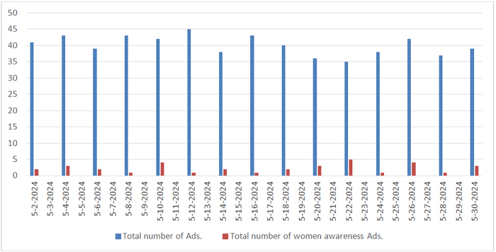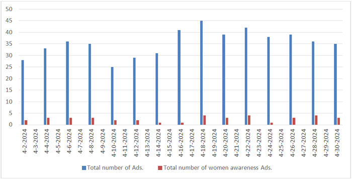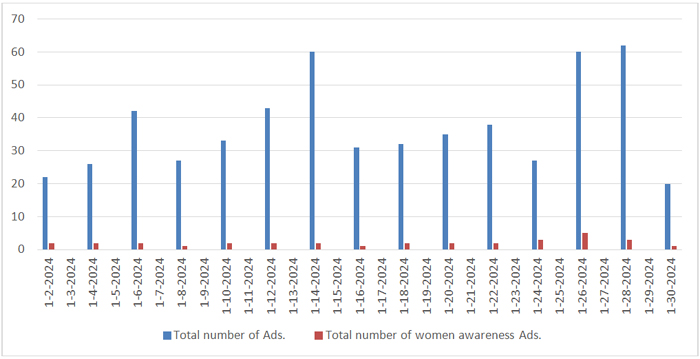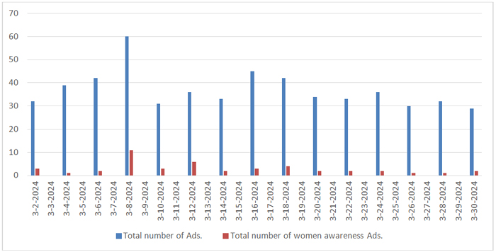These findings show that while efforts were made to raise women’s awareness through advertisements, the amount of prominence given to such ads fluctuated, indicating potential areas for enhanced visibility and sustained focus on women-centric message in future advertising campaigns.