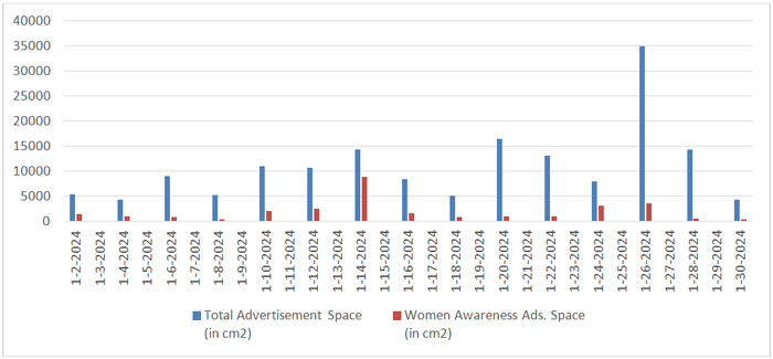 In the month of January, total number of days selected were fifteen as shown in Table 1. In these fifteen days total number of advertisements published were 558, including 28 women awareness ads., total space covered by advertisements was 1,64,267 cm², with women awareness ads taking up 28,705 cm², or 17.47% of the total ad space.