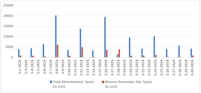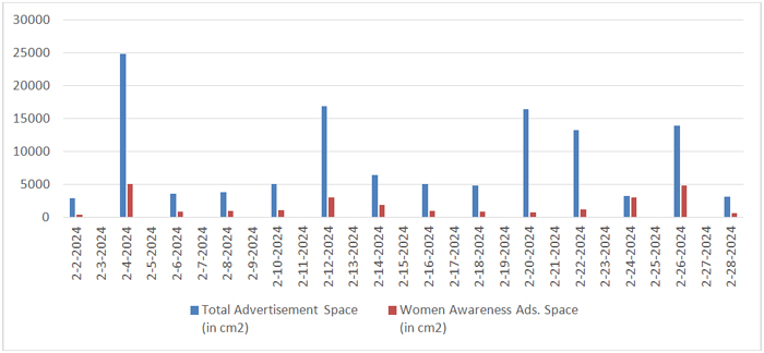 In the month of February, total number of days selected were fourteen as shown in Table 2. In these fourteen days total number of advertisements published were 502, including 46 women awareness ads., total space covered by advertisements was 1,23,234 cm², with women awareness ads taking up 25,377 cm², or 20.59% of the total ad space.