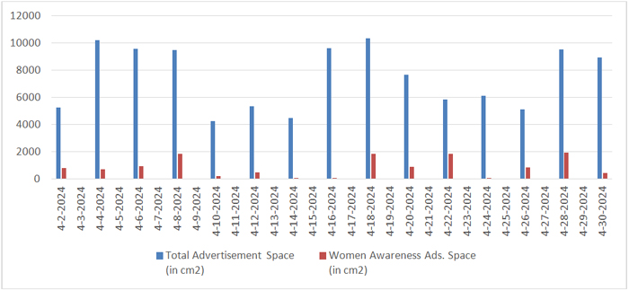 In the month of April, total number of days selected were fifteen as shown in Table 4. In these fifteen days total number of advertisements published were 532, including 39 women awareness ads., total space covered by advertisements was 1,11,660 cm², with women awareness ads taking up 12,984 cm², or 11.62% of the total ad space.