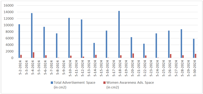 In the month of May, total number of days selected were fifteen as shown in Table 5. In these fifteen days total number of advertisements published were 601, including 35 women awareness ads., total space covered by advertisements was 1,33,145 cm², with women awareness ads taking up 11,776 cm², or 8.8% of the total ad space.