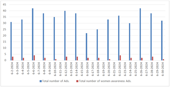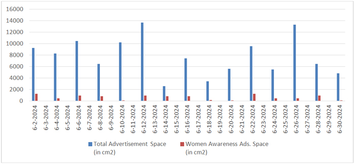 In the month of June, total number of days selected were fifteen as shown in Table 6. In these fifteen days total number of advertisements published were 515, including 35 women awareness ads., total space covered by advertisements was 1,17,030 cm², with women awareness ads taking up 9,304 cm², or 7.9% of the total ad space.