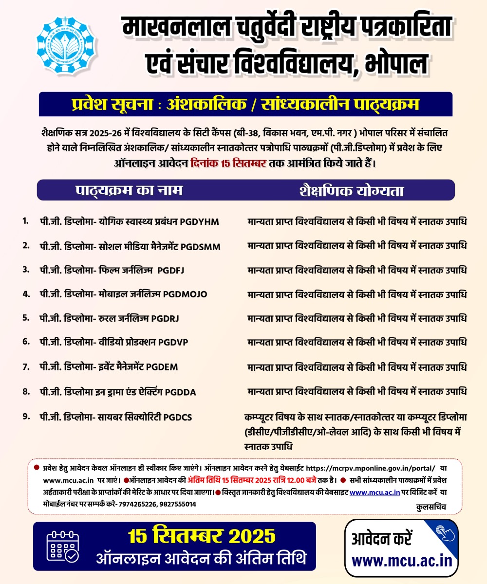 - आवश्यक सूचना: विश्वविद्यालय के भोपाल, खण्डवा, रीवा एवं दतिया परिसरों में संचालित पाठ्यक्रमों में ”पहले आओ पहले पाओ” के आधार पर सीधे प्रवेश हेतु ऑनलाईन आवेदन 30 अगस्त, 2025 तक आमंत्रित (15/08/2025)