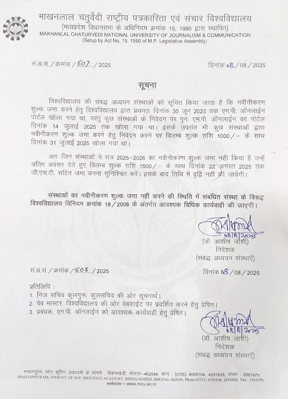 - परिपत्र- कुछ संबद्ध अध्ययन संस्थाओं द्वारा गठित Makhanlal Associated Study Institute Directors Welfare Society Indore ”संघ” के संबंध में स्थिति स्पष्ट करने बाबत् (16/10/2023)