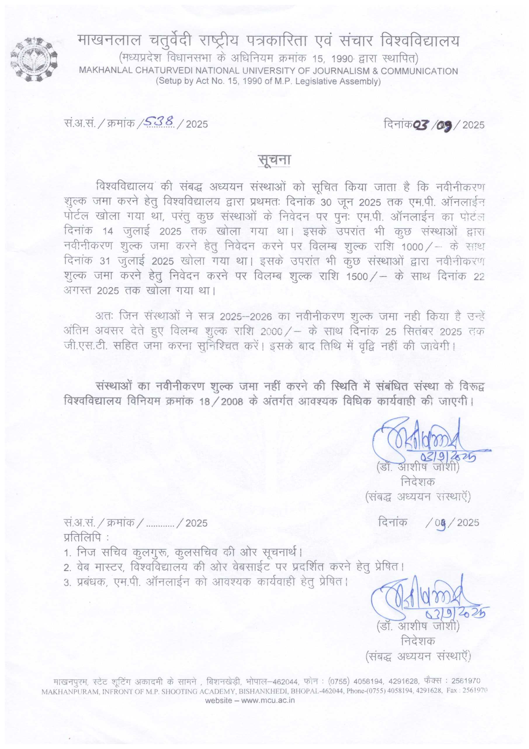 - अधिसूचना: विश्वविद्यालय से संबद्ध अध्ययन संस्थाओं (मीडिया एवं आई.टी.) संचालन की व्यवस्था में लागू विभिन्न मदों हेतु शुल्क निर्धारित