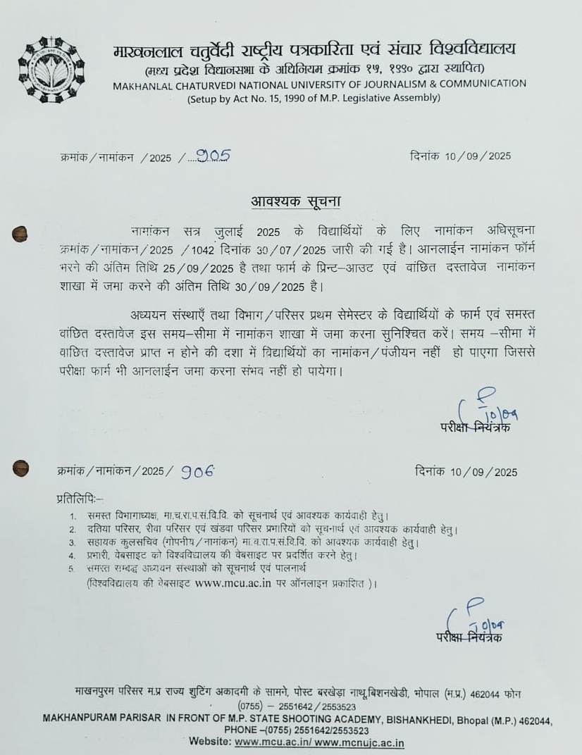 नामांकन सत्र जुलाई 2025 के संबंध मे आवश्यक सूचना 10/09/2025
