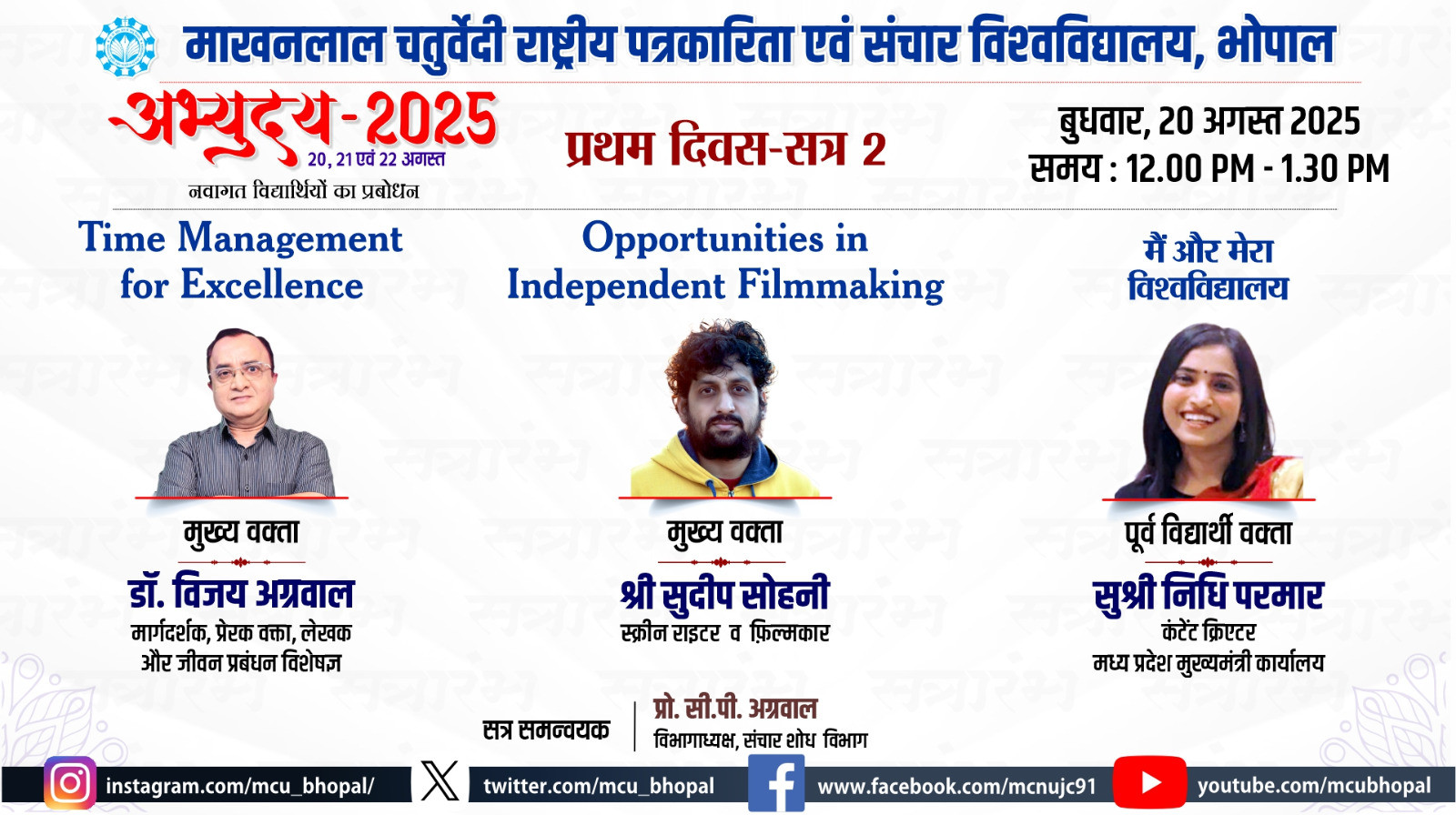 рдПрдорд╕реАрдпреВ рдХрд╛ рддреАрди рджрд┐рд╡рд╕реАрдп рд╕рддреНрд░рд╛рд░рдВрдн рдХрд╛рд░реНрдпрдХреНрд░рдо ‘рдЕрднреНрдпреБрджрдп’ 20 рдЕрдЧрд╕реНрдд рд╕реЗ рд╕рддреНрд░рд╛рд░рдВрдн рдореЗрдВ рдореБрдЦреНрдпрдордВрддреНрд░реА рдбреЙ. рдореЛрд╣рди рдпрд╛рджрд╡ рдФрд░ рдХрд╡рд┐ рдбреЙ. рдХреБрдорд╛рд░ рд╡рд┐рд╢реНрд╡рд╛рд╕ рдХрд░реЗрдВрдЧреЗ рджрд╛рджрд╛ рдорд╛рдЦрдирд▓рд╛рд▓ рдХреА рдкреНрд░рддрд┐рдорд╛ рдХрд╛ рдЕрдирд╛рд╡рд░рдг рд╡рд┐рджреНрдпрд╛рд░реНрдерд┐рдпреЛрдВ рдорд┐рд▓реЗрдЧрд╛ рдкрддреНрд░рдХрд╛рд░рд┐рддрд╛, рдбрд┐рдЬрд┐рдЯрд▓ рдореАрдбрд┐рдпрд╛, рд╕рд┐рдиреЗрдорд╛ рдЬрдирд╕рдВрдкрд░реНрдХ, рдкреНрд░рдмрдВрдзрди, рдЖрдИрдЯреА рдЖрджрд┐ рд╡рд┐рд╖рдпреЛрдВ рдкрд░ рджрд┐рдЧреНрдЧрдЬ рд╡рд┐рд╢реЗрд╖рдЬреНрдЮреЛрдВ рдХрд╛ рдорд╛рд░реНрдЧрджрд░реНрд╢рди рдбреЙ. рдХреБрдорд╛рд░ рд╡рд┐рд╢реНрд╡рд╛рд╕ рдХрд╛ ‘рд░рд╛рдорд╛рдпрдг рдореЗрдВ рд╕рдВрдЪрд╛рд░’ рдкрд░ рдЙрджреНрдмреЛрдзрди рд╕рддреНрд░рд╛рд░рдВрдн рд╕рдорд╛рд░реЛрд╣…