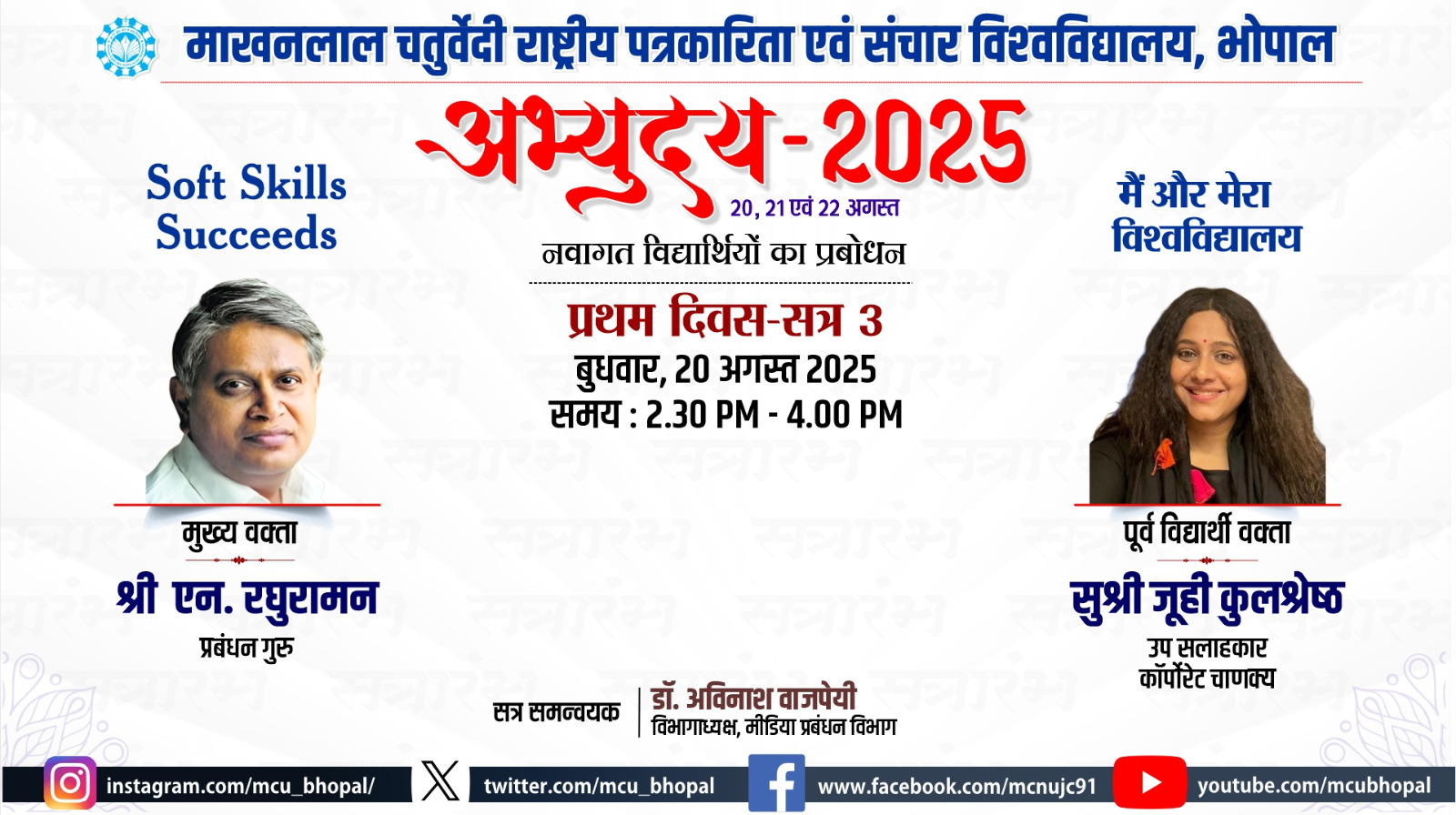 рдЗрд╕ рджрд┐рди ‘рд╕реЙрдлреНрдЯ рд╕реНрдХрд┐рд▓реНрд╕’ рдкрд░ рдкреНрд░рдЦреНрдпрд╛рдд рд╕реНрддрдВрднрдХрд╛рд░ рдФрд░ рд▓реЗрдЦрдХ рдПрди. рд░рдШреБрд░рд╛рдорди рдХрд╛ рд╡реНрдпрд╛рдЦреНрдпрд╛рди рд╣реЛрдЧрд╛ рд╕рд╛рде рд╣реА ‘рдПрдЖрдИ рдЗрдирдлреНрд▓реБрдПрдВрд╕реНрдб рдореАрдбрд┐рдпрд╛ рдЯреЗрдХреНрдиреЙрд▓рд╛рдЬреА’ рдкрд░ рдЖрд╢реАрд╖ рдХреБрд▓рдХрд░реНрдгреА рдХрд╛ рдЙрджреНрдмреЛрдзрди рд╣реЛрдЧрд╛ред