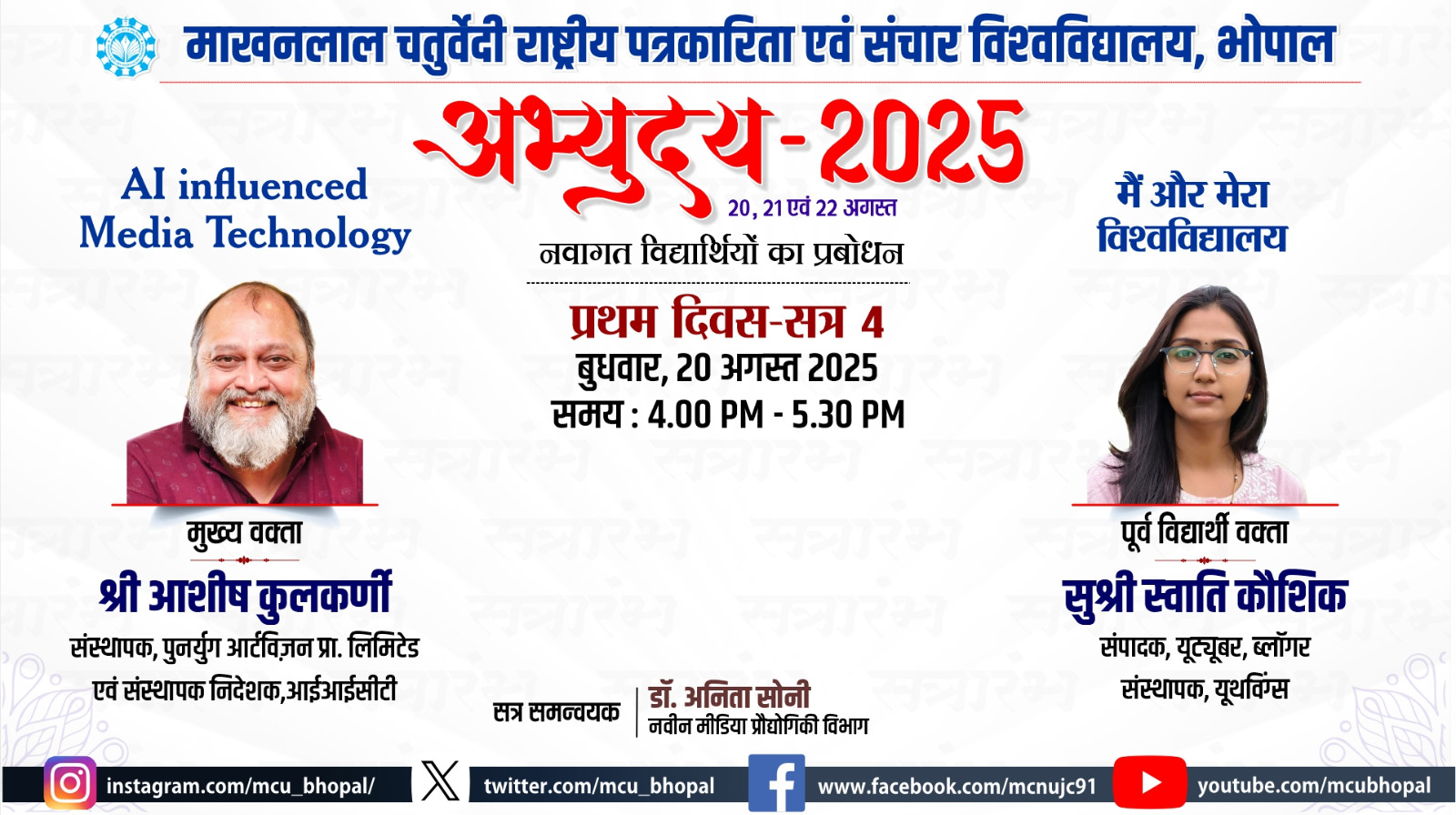 рднреЛрдкрд╛рд▓ред рдорд╛рдЦрдирд▓рд╛рд▓ рдЪрддреБрд░реНрд╡реЗрджреА рд░рд╛рд╖реНрдЯреНрд░реАрдп рдкрддреНрд░рдХрд╛рд░рд┐рддрд╛ рдПрд╡рдВ рд╕рдВрдЪрд╛рд░ рд╡рд┐рд╢реНрд╡рд╡рд┐рджреНрдпрд╛рд▓рдп, рднреЛрдкрд╛рд▓ рдХреЗ рдЕрдХрд╛рджрдорд┐рдХ рд╕рддреНрд░ 2025-2026 рдХрд╛ рд╕рддреНрд░рд╛рд░рдВрдн рд╕рдорд╛рд░реЛрд╣ ‘рдЕрднреНрдпреБрджрдп’ рджрд┐рдирд╛рдВрдХ 20, 21 рдПрд╡рдВ 22 рдЕрдЧрд╕реНрдд рдХреЛ рдЖрдпреЛрдЬрд┐рдд рд╣реЛ рд░рд╣рд╛ рд╣реИред рд╕рддреНрд░рд╛рд░рдВрдн рдХреЗ рддреАрдиреЛрдВ рджрд┐рди рдЕрд▓рдЧ-рдЕрд▓рдЧ рд╕рддреНрд░реЛрдВ рдореЗрдВ рдореАрдбрд┐рдпрд╛, рдкрддреНрд░рдХрд╛рд░рд┐рддрд╛, рд╕рд╛рд╣рд┐рддреНрдп, рдкреАрдЖрд░, рд╡рд┐рдЬреНрдЮрд╛рдкрди, рд╕рд┐рдиреЗрдорд╛, рдореАрдбрд┐рдпрд╛ рдЯреЗрдХреНрдиреЙрд▓рд╛рдЬреА, рдореАрдбрд┐рдпрд╛ рдкреНрд░рдмрдВрдзрди, рдХрд╛рдиреВрди рдФрд░ рд╕рдВрд╕реНрдХреГрддрд┐ рдХреА рджрд┐рдЧреНрдЧрдЬ рд╣рд╕реНрддрд┐рдпреЛрдВ рдХреА рдореМрдЬреВрджрдЧреА рд░рд╣реЗрдЧреАред рдЦрд╛рд╕ рдмрд╛рдд рд╣реИ рдХрд┐ рдЗрд╕ рдЕрд╡рд╕рд░ рдкрд░ рдкрд░рд┐рд╕рд░ рдореЗрдВ рд╕реНрдерд╛рдкрд┐рдд рджрд╛рджрд╛ рдорд╛рдЦрдирд▓рд╛рд▓ рдЪрддреБрд░реНрд╡реЗрджреА рдХреА 12 рдлреБрдЯ рдКрдВрдЪреА рдкреНрд░рддрд┐рдорд╛ рдХрд╛ рдЕрдирд╛рд╡рд░рдг рдореБрдЦреНрдпрдордВрддреНрд░реА рдбреЙ. рдореЛрд╣рди рдпрд╛рджрд╡ рдФрд░ рдЬрд╛рдиреЗ-рдорд╛рдиреЗ рдХрд╡рд┐, рдбреЙ. рдХреБрдорд╛рд░ рд╡рд┐рд╢реНрд╡рд╛рд╕ рдХрд░реЗрдВрдЧреЗред рдЗрд╕ рджреМрд░рд╛рди рдЕрддрд┐рдерд┐рдпреЛрдВ рджреНрд╡рд╛рд░рд╛ рдкрд░рд┐рд╕рд░ рдореЗрдВ рдкреМрдзрд╛рд░реЛрдкрдг рднреА рдХрд┐рдпрд╛ рдЬрд╛рдПрдЧрд╛ред рдбреЙ. рдХреБрдорд╛рд░ рд╡рд┐рд╢реНрд╡рд╛рд╕ ‘рд░рд╛рдорд╛рдпрдг рдореЗрдВ рд╕рдВрдЪрд╛рд░’ рд╡рд┐рд╖рдп рдкрд░ рдЕрдкрдирд╛ рдЙрджреНрдмреЛрдзрди рджреЗрдВрдЧреЗред