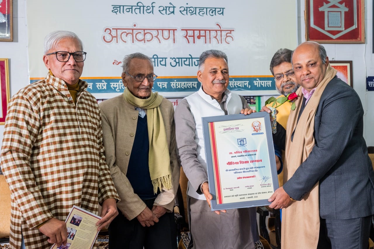 भोपाल, 15 जनवरी, 2025: मीडिया के ज्ञान तीर्थ माधवराव सप्रे स्मृति समाचार पत्र संग्रहालय एवं शोध संस्थान द्वारा प्रतिवर्ष दिये जाने वाले राज्य स्तरीय अलंकरण समारोह में प्रो. पवित्र श्रीवास्तव को”मीडिया शिक्षा सम्मान” से सम्मानित किया गया है। मकर संक्रान्ति के शुभ अवसर पर सप्रे संग्रहालय में संपन्न सम्मान समारोह में मध्यप्रदेश के उच्चशिक्षा मंत्री श्री इंदर सिंह परमार ने माखनलाल चतुर्वेदी राष्ट्रीय पत्रकारिता एवं संचार विश्वविद्यालय के विज्ञापन एवं जनसंपर्क विभाग के विभागाध्यक्ष प्रोफेसर डॉ. पवित्र श्रीवास्तव को मीडिया शिक्षा के क्षेत्र में उत्कृष्ट योगदान के लिए “मीडिया शिक्षा सम्मान” से सम्मानित किया। इस अवसर पर बरकतउल्ला विश्वविद्यालय के कुलगुरु प्रो. एस. के. जैन तथा संग्रहालय के संस्थापक पद्मश्री श्री विजयदत्त श्रीधर उपस्थित थे। गौरतलब है कि सप्रे संग्रहालय प्रतिवर्ष पत्रकारिता की विभिन्न विधाओं में उल्लेखनीय कार्य करने वाली हस्तियों को सम्मानित करता है।