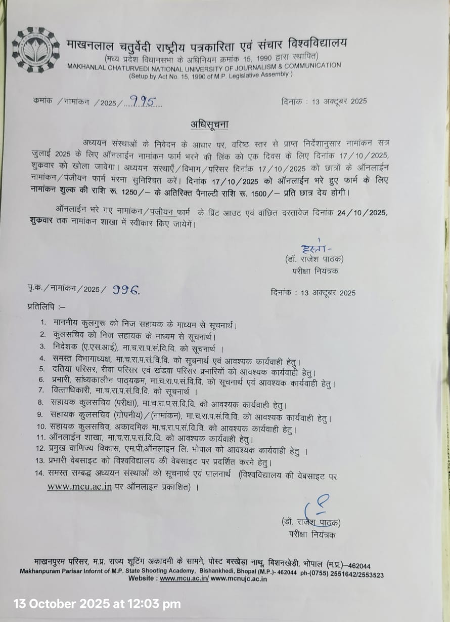 - संशोधित अधिसूचना – नामाँकन सत्र जुलाई 2025 हेतु एक दिवस दिनाक 17/10/2025 शुक्रवार को ऑनलाइन नामाँकन फॉर्म भरने सम्बन्धी (दिनाक 15.10.2025)।