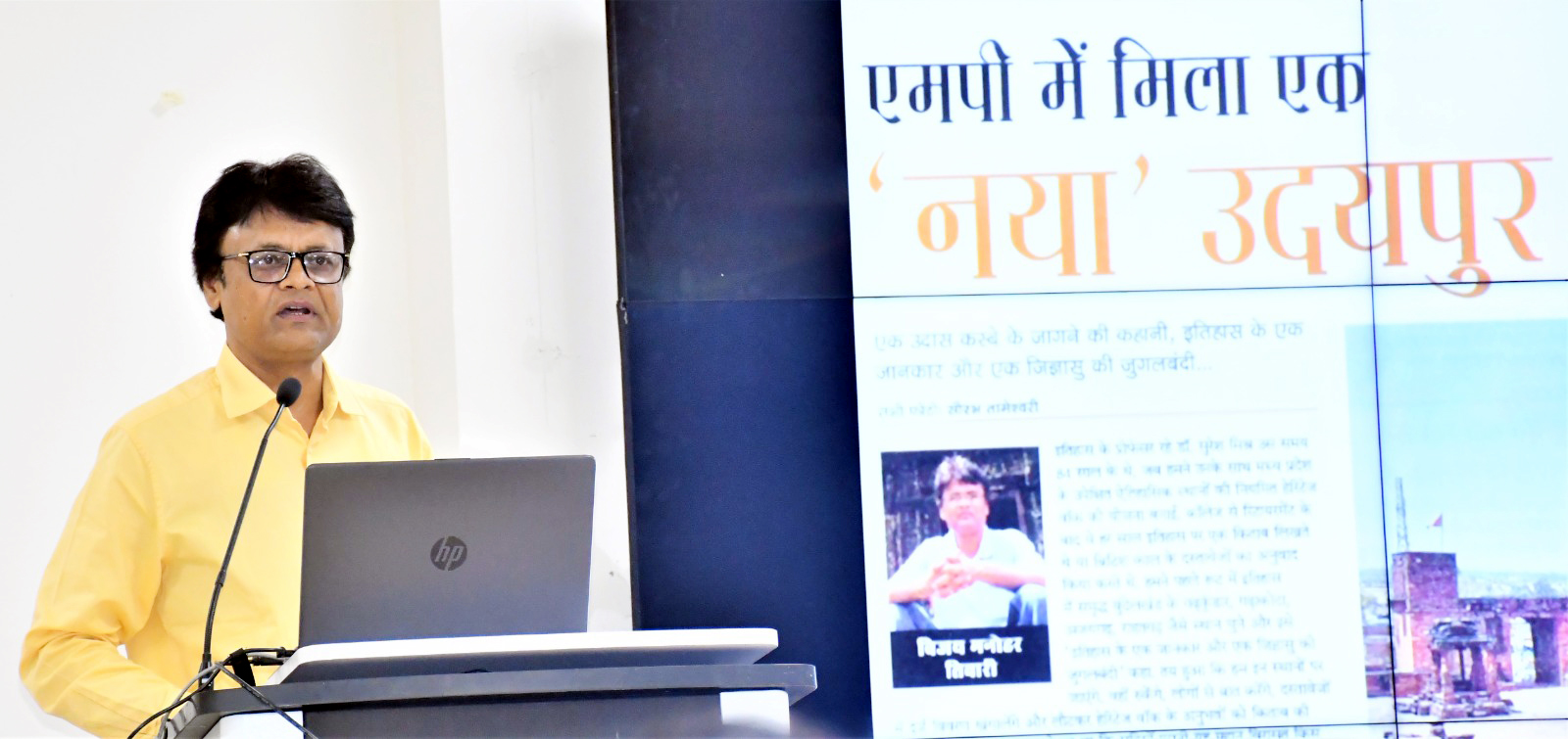 इस सत्र में कार्यक्रम की अध्यक्षता कर रहे विश्वविद्यालय के कुलगुरू श्री विजय मनोहर तिवारी ने पब्लिक मीडिया टेक फाउंडेशन को इस तरह के महत्वपूर्ण विषय पर कार्यशाला आयोजित करने के लिए धन्यवाद देते हुए कहा कि सोशल मीडया बहुत बड़े पैमाने पर सकारात्मक बदलाव ला सकता है। राजधानी भोपाल के पास ही स्थित उदयपुर कस्बे के गौरवशाली इतिहास और वहां की पुरातात्विक महत्व के स्थापत्य के संरक्षण में सोशल मीडिया की भूमिका से जुड़ा एक प्रसंग साझा किया। उन्होंने बताया कि किस तरह उन्होंने वहां भ्रमण करने के बाद मंथली हेरिटेज वॉक की शुरूआत की जिसमें कई जानी मानी हस्तियों ने वहां जाकर उदयपुर की ऐतिहासिक विरासत को देखा। वहां उन धरोहरों पर कई अवैध अतिक्रमण थे। राजा उदयादित्य के महल पर भी निजी संपत्ति का बोर्ड चस्पा था। सोशल मीडिया प्लेटफॉर्म्स पर उन्होंने इस संबंध में पोस्ट डालीं। बाद में मीडिया में भी इस विषय पर चर्चा हुई। इसके बाद स्थानीय प्रशासन ने उदयपुर की उन ऐतिहासिक धरोहरों को मुक्त करवाकर पुरातत्व विभाग को सौंपी और वहां के लोगों में भी हेरिटेज को लेकर जागृति का माहौल निर्मित हुआ।