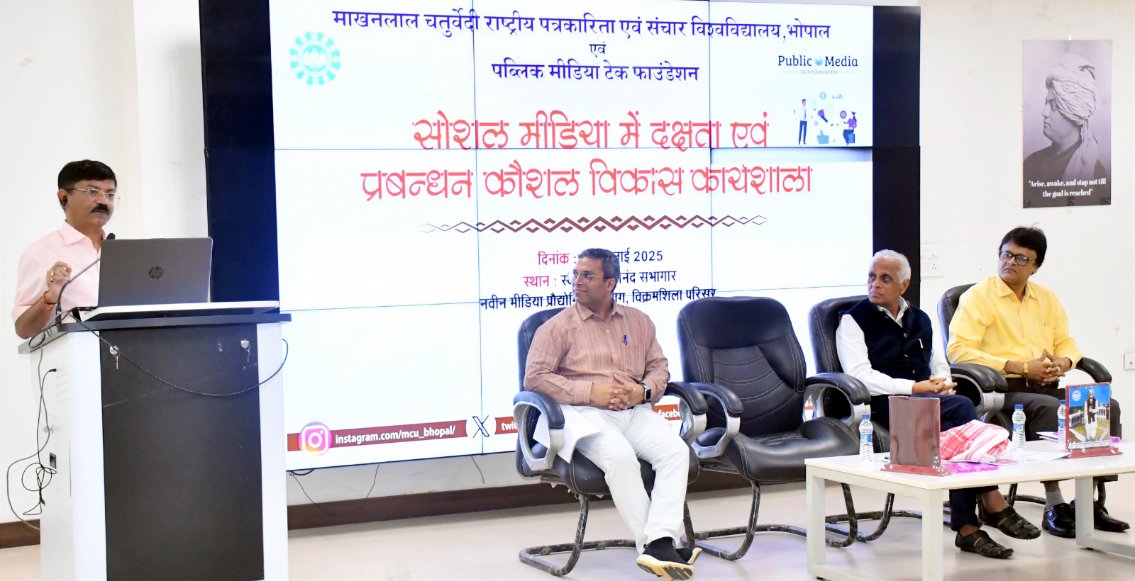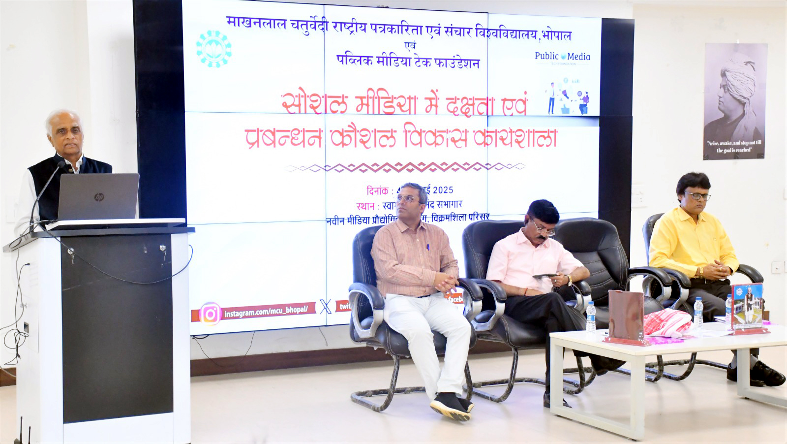 भोपाल, 04 जुलाई, 2025: माखनलाल चतुर्वेदी राष्ट्रीय पत्रकारिता एवं संचार विश्वविद्यालय भोपाल और पब्लिक मीडिया टेक फाउंडेशन के संयुक्त तत्वावधान में सोशल मीडिया के उपयोगकर्ताओं के लिए विश्वविद्यालय परिसर में सोशल मीडिया में दक्षता एवं प्रबन्धन कौशल विकास विषय पर दो दिवसीय कार्यशाला आरंभ हुई। कार्यक्रम के उद्घाटन सत्र में अतिथियों द्वारा मां सरस्वती, भारत माता एवं दादा माखन लाल चतुर्वेदी जी के चित्रों पर पुष्प अर्पित किए। इसके बाद कुलगुरू श्री विजय मनोहर तिवारी ने अतिथियों को पुस्तक तथा स्मृति चिन्ह देकर स्वागत किया।